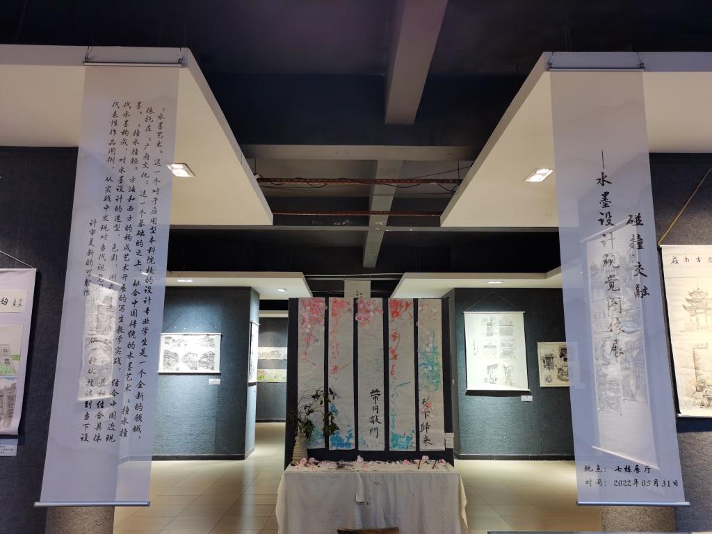 “水墨艺术”这一个对于设计专业学生是一个全新的领域,课程依托在“广府文化”这一个基础的之上,融合中国传统的水墨艺术“撞水撞墨”“撞水撞粉”方法和西方的构成艺术开展的写生教学实践。结合中国近现代水墨构成,对水墨设计的造型、色彩、图式等进行研究分析,并相结合具体代表性作品图例,从实践中建立当代视觉图像从技法到当下设计审美新的可能性。本次展览分两部分:一是广府文化的水墨探索,以个人作品呈现;另外一个就是立足当下发现身边的美,挖掘校园的美,以小组作品呈现。