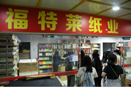 研学活动的最后一项为参观金天成印刷包装城特种纸市场,学生们分为两组,在工作人员的带领下有序参观特种纸专区,档口的商家们都认真、热情地为学生们介绍特种纸的样式、克重、再利用等知识,这些都是在参观中可以直观学习到的知识,让学生们受益良多。