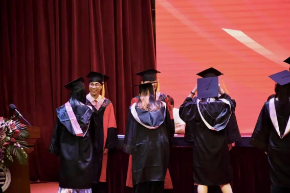 毕业典礼在庄严的国歌声中拉开帷幕,教师代表、学生代表发言,校领导致辞,随着欢乐的乐曲响起,毕业生们依次走上礼台,重续四年的大学时光,与会领导为毕业生们正冠拨穗。