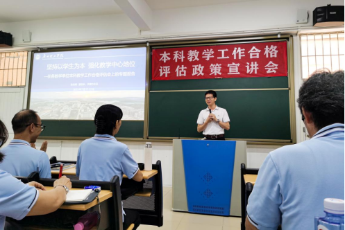 陈英征部长作了关于“规范教学行为,提高教育教学水平和人才培养质量”的报告。陈部长对合格评估方案的核心内容中“一个引导”“两个突出”“三个基本”“四个促进”进行阐述,要求全体教师主动学习与教学相关的规章制度(含上级文件、校级文件)、积极参与集体备课活动、用平常心、正常态去对待评估,以学习心、开放态来参与评估。