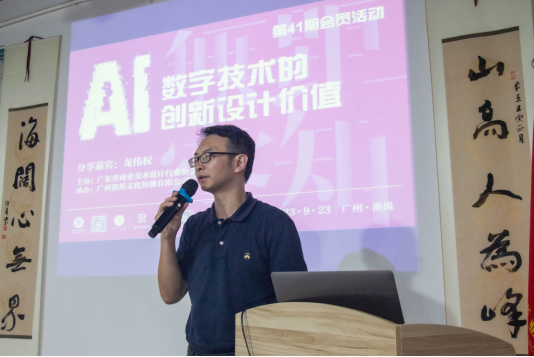 本次主题分享邀请了理事单位广州简形文化传播有限公司总经理龙伟权先生,他提出“AI打破设计界限”,分享了用不同的AI软件在插画、平面设计、产品设计等领域的最新应用案例,并讨论了AI如何推动设计创新。