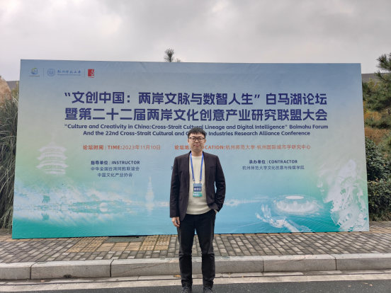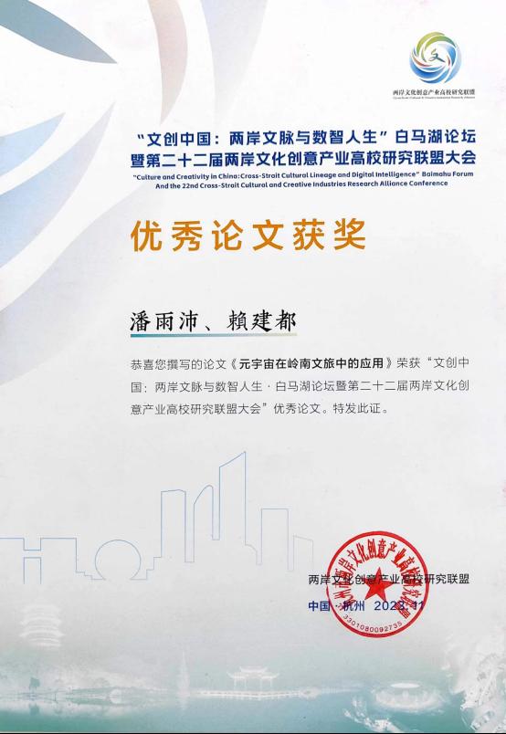 (潘雨沛)2023年11月10日,第二十二届两岸文化创意产业高校研究联盟大会在杭州召开。我院视觉传达设计系潘雨沛老师席了本次论坛并作了《元宇宙在岭南文旅中的应用》主题发言。其观点获得了在场点评专家的认同,其学术论文也获得了论坛颁发的“优秀论文奖”。