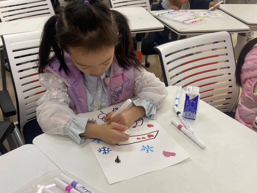 绘画小班本节课主题:“冬日雪景”。通过欣赏雪景的照片让小朋友们感受冬日雪景的色彩美。小朋友们观察白天和夜晚不同雪景的色调变化与特征,老师教同学们运用前景、中景和远景的构图方式画出雪景的场景,使画面更具有立体感。