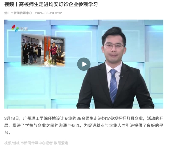 佛山市新闻传媒中心通过新闻与视频形式报道我院陈丽娜老师带领境设计专业学生到企业进行拓岗与参观学习