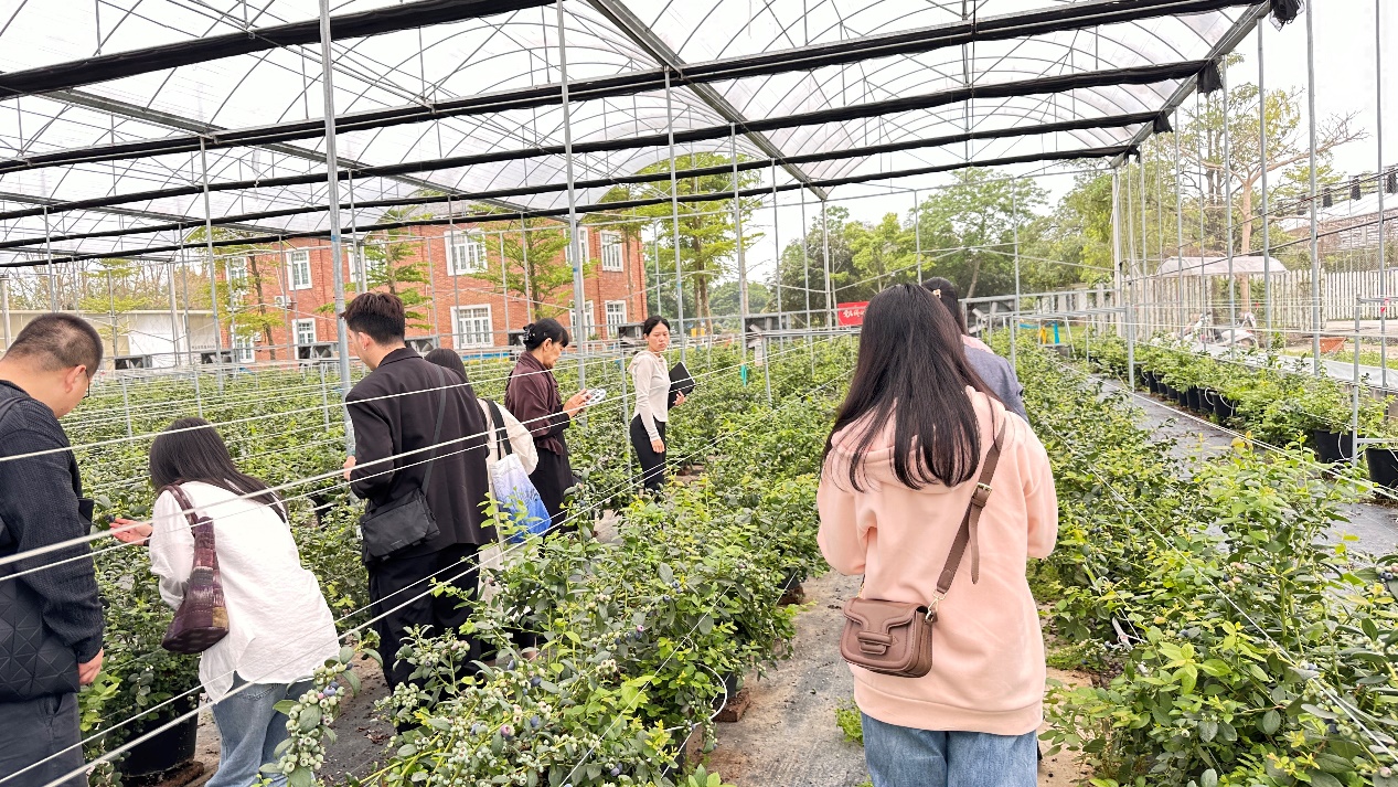 师生团队深入到蓝莓种植园区,实地考察了蓝莓的生长情况,听取了基地负责人李勇先生关于基地规模、种植技术、市场销售、经济效益等方面的介绍。