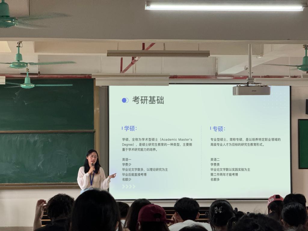 讲座在下午16:00准时开始,刘丽君老师首先分享了自己的考研经验,她的话语中透露出对学术探索的热情和对知识深度的追求。她指出,考研不仅能开拓学生的国际视野,还能显著提升个人的学历层次,从而增加就业机会和社会地位。接着,刘老师深入分析了学硕与专硕的区别,以及全日制与非全日制研究生教育的特点。她强调,学生应根据自己的职业规划和兴趣选择适合的研究生类型。此外,刘老师还对国内外考研的区别进行了细致的阐述,包括教育体系、入学要求和学术氛围等方面。