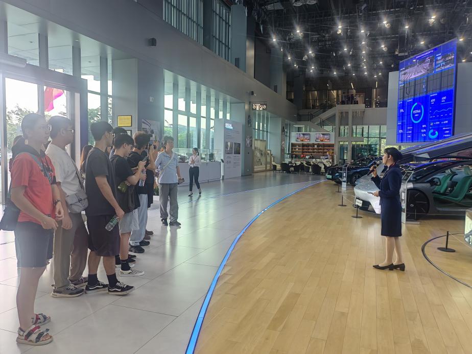 上午,同学们首先参观了位于广州南沙区的广汽科技馆。作为广汽集团科技创新成果的展示窗口,科技馆全面展示了广汽在动力科技、新能源科技、智能网联等领域的最新进展。同学们在这里不仅领略了科技与设计的完美融合,还对低碳技术和绿色展馆建筑有了更深入的了解。此次活动提升学生们的实践能力和创新思维,通过亲身体验,深入理解综合设计在现代科技场馆中的应用。
