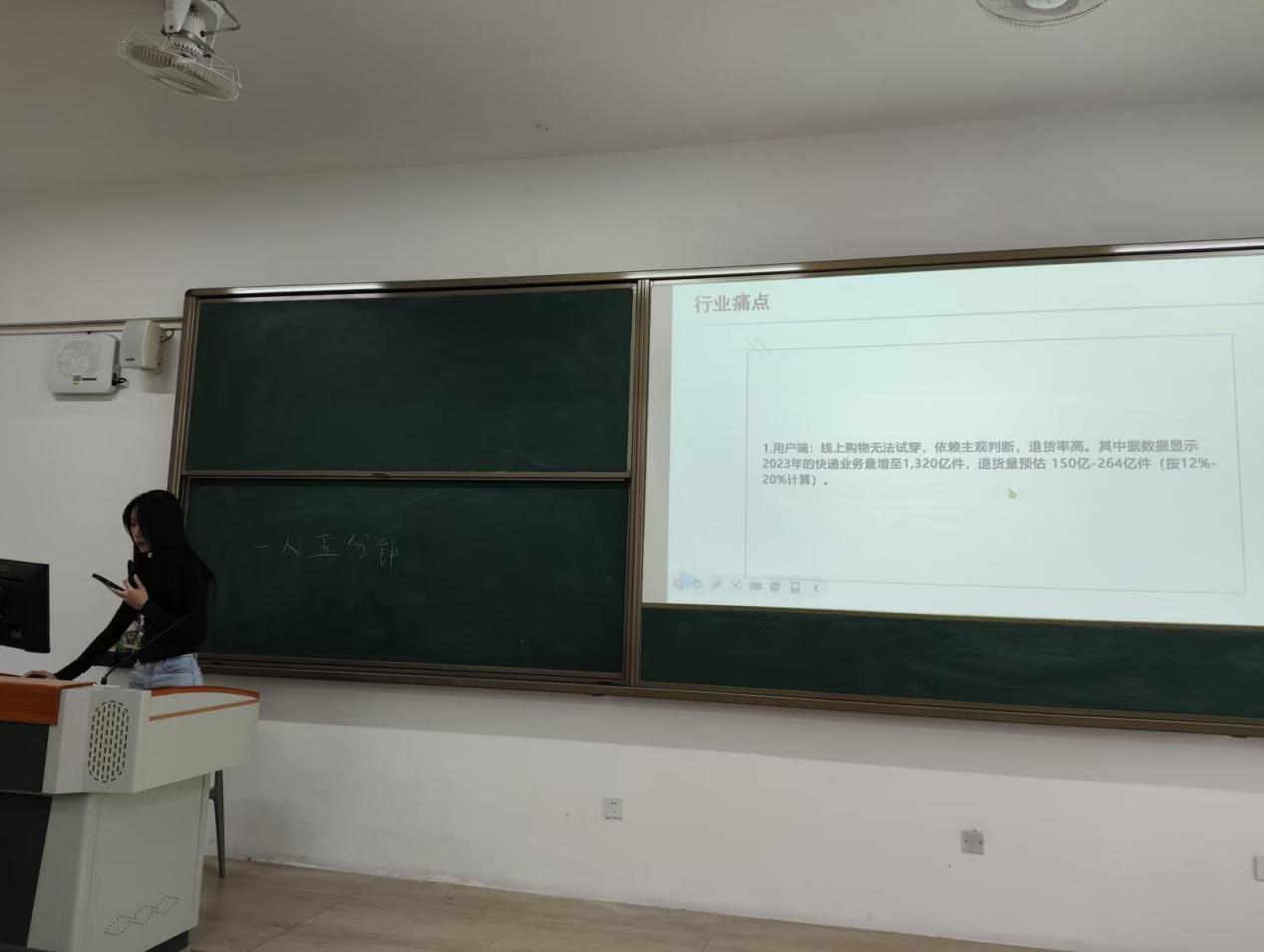 活动现场,各小组选派代表阐述创新创业项目。这些项目亮点纷呈,有的聚焦低空经济领域,提出了具有前瞻性的无人机服务创业计划;有的着眼电商行业,提供AI虚拟试穿服务,引领行业新潮流;还有的搭建非遗文化数字创新平台,推动传统文化的现代传承。参赛团队从市场分析、运营模式及发展规划等维度展开论述,充分展现其商业思维与实践能力。