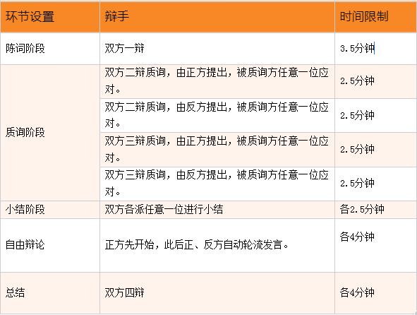 赛制分陈词、质询、小结、自由辩论、总结共计5个环节。净比赛时间38分钟。