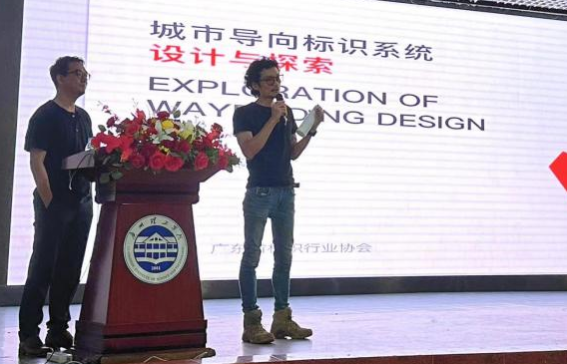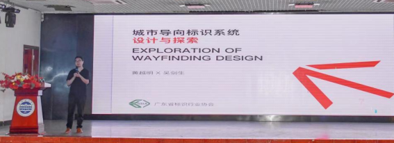 讲座首先由黄越明黄总开始。黄总通过广东省标识行业协会以及自己公司的许多成功的实战案例,分析讲解了什么是城市导向标识系统的基本概念,其中涉及了品牌设计、产品设计、空间环境图形设计、室内设计、景观设计等多专业的复合型设计的实践与探索;然后是吴剑生吴总上台做讲座,他主要从鲜度公司一个非常成功的案例,也是一个在许多大赛评奖中获得了众多荣誉的“国投健康·嘉栖长者公寓”——养老机构导视系统规划设计、施工的具体设计,从理念到执行,从材料到施工进行了深入的分析和讲解。