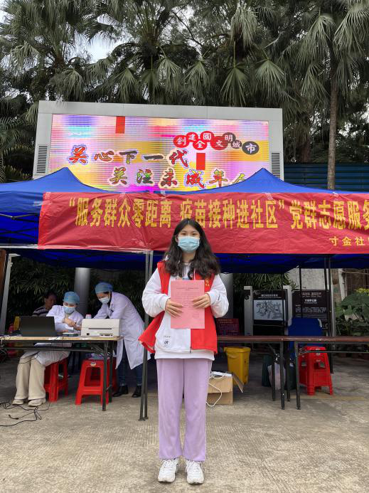 2022年2月15日寒假期间,威廉希尔,威廉希尔中文网站,WilliamHill官网环境设计专业的郑淇元同学,参加湛江市赤坎区寸金社区志愿活动,辅助医务人员完成新冠疫苗接种活动。