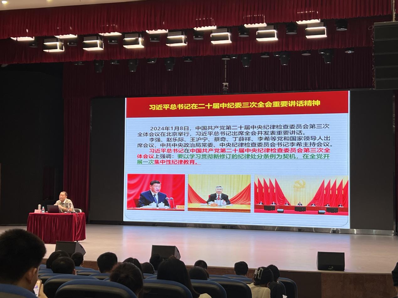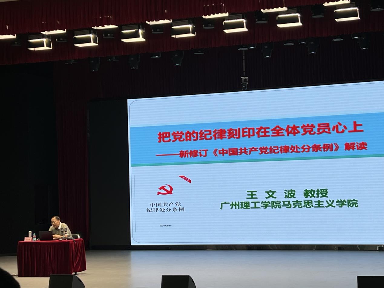 王文波教授以习近平总书记关于党纪的系列重要讲话引入,列举了大量详实的各类违纪典型案例,强调了持之以恒推进全面从严治党的必要性。结合《条例》历次修订工作,逐一分析了历次条例修订的特点、目的和内容,并重点针对新修订条例的政治纪律、组织纪律、廉洁纪律、群众纪律、工作纪律、生活纪律及其违反行为进行了解读。通过生动案例阐述党纪的重要性以及党员应如何严守党的纪律,让师生党员深刻认识到纪律严明是我党光荣传统和独特优势,希望全体师生党员能把新修订《条例》学深悟透,严守党的各项纪律,明明白白做事,清清白白做人。