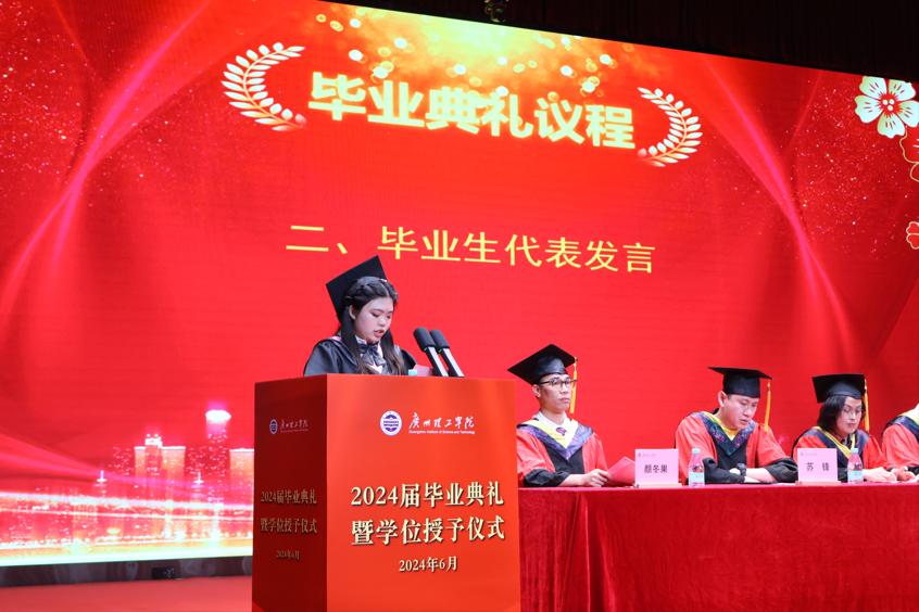 优秀毕业生代表20环境1班叶雅怡发言,在这里她度过了人生最难忘的时光。学院不仅注重专业知识的传授,更重视对学生艺术素养的培养,经常组织各种艺术展览和活动,还邀请业内专家对我们传授经验进行指导,这些活动让她有了机会接触到最前沿的设计理念。最后她祝贺同学们,无论未来遇到多少困难和挑战,都要保持坚定的信念和勇气,不断追求自己的梦想。