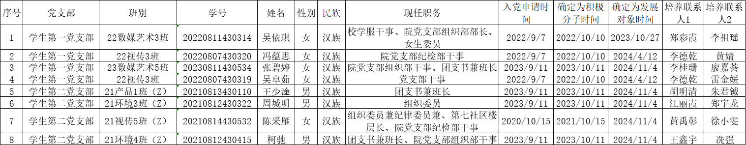 经党总支部审查,拟将吴依琪等8名同志发展为中共预备党员,为增强发展党员工作的透明度,强化群众的监督作用,减少工作失误和偏差,确保党员发展工作质量,根据发展党员工作有关要求,现将具体情况公示如下。