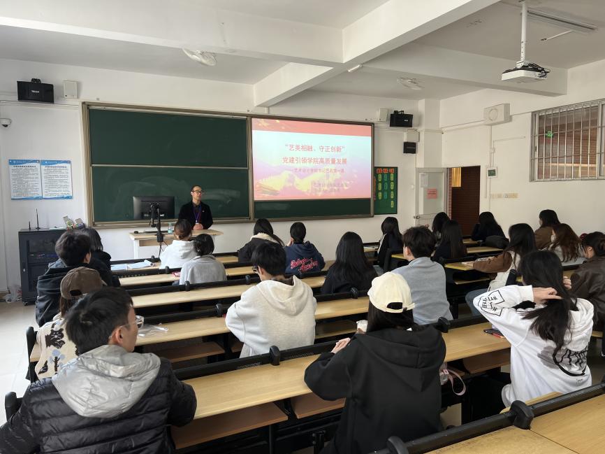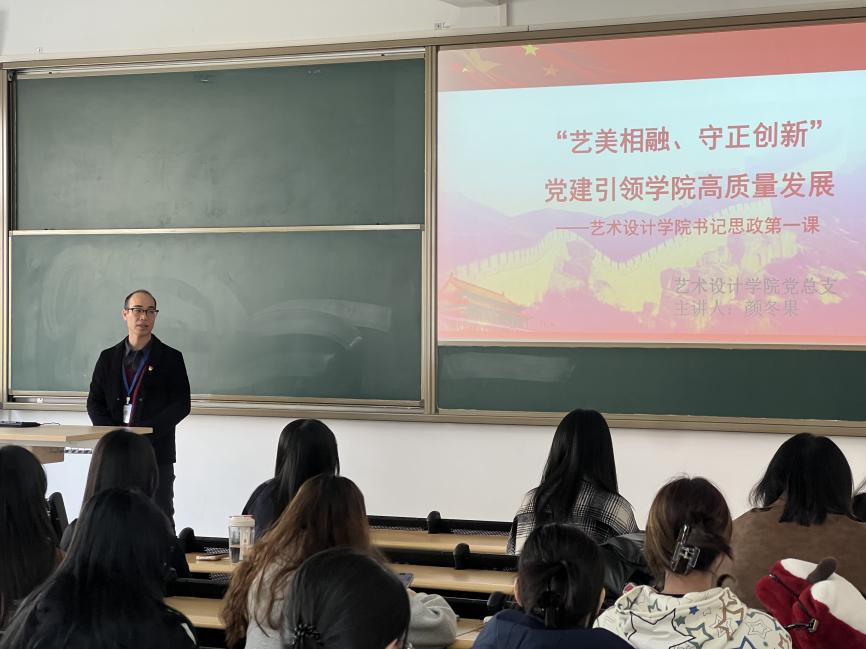 课堂上,颜书记以“艺术之美与信仰之力”为切入点,深入阐释了艺术设计与思想政治教育的融合路径。他强调,新时代艺术人才应坚持“守正创新”,既要传承中华优秀传统文化,扎根人民、扎根生活,又要以创新思维回应时代需求,用艺术语言讲好中国故事。“艺术不仅是技艺的锤炼,更是价值观的塑造。”颜书记结合学院“艺美育心”学生党支部的实践案例,提出“三个融合”理念——专业学习与党性修养相融合、艺术创作与思政育人相融合、个人成长与社会责任相融合,号召学生党员以美育心、以心铸魂,成为有理想、有情怀、有担当的艺术工作者。