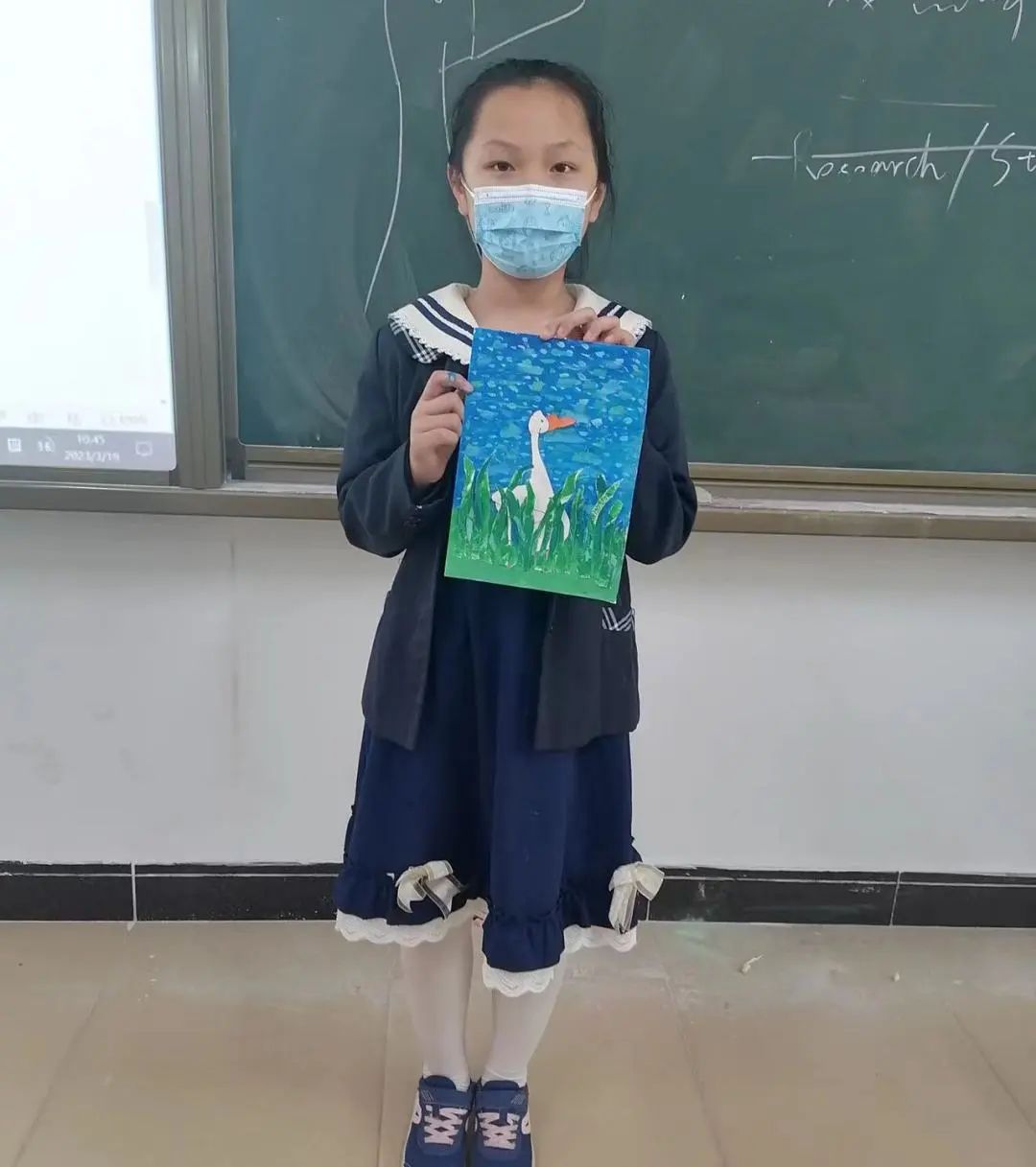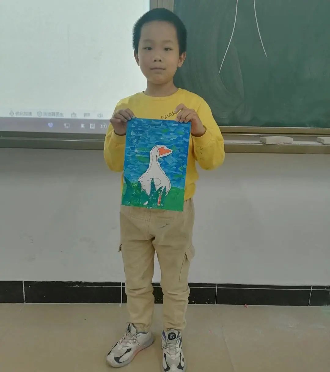绘画大班以《草丛中的小鸭子》为主题,学习用半立体的方式,制作湖水背景和草丛肌理。湖水的波纹需要耐心地用点来表现波光粼粼,为大白鹅创造一个清新的湖面,绘画和剪贴的方式极大地锻炼学生的动手能力、培养画面空间的构图能力。
