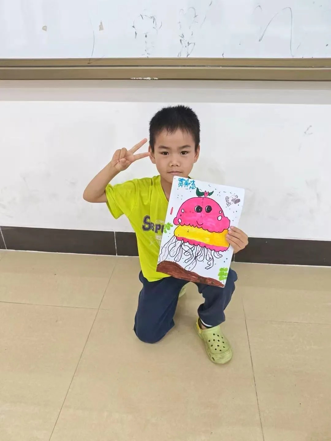 尤为值得一提的是,此次绘画班给予小朋友们充分的自由创作空间,积极鼓励他们发挥天马行空的想象力,去创造出别具一格的水母宝宝。他们依据自己的喜好,有的为水母精心添加了或大或小、或圆或弯的眼睛,有的给水母配上了形态各异的嘴巴,还有的为水母绘制上五彩斑斓、独具特色的花纹等装饰;设计出形状各不相同、颜色绚丽多彩的水母,让人眼前一亮。