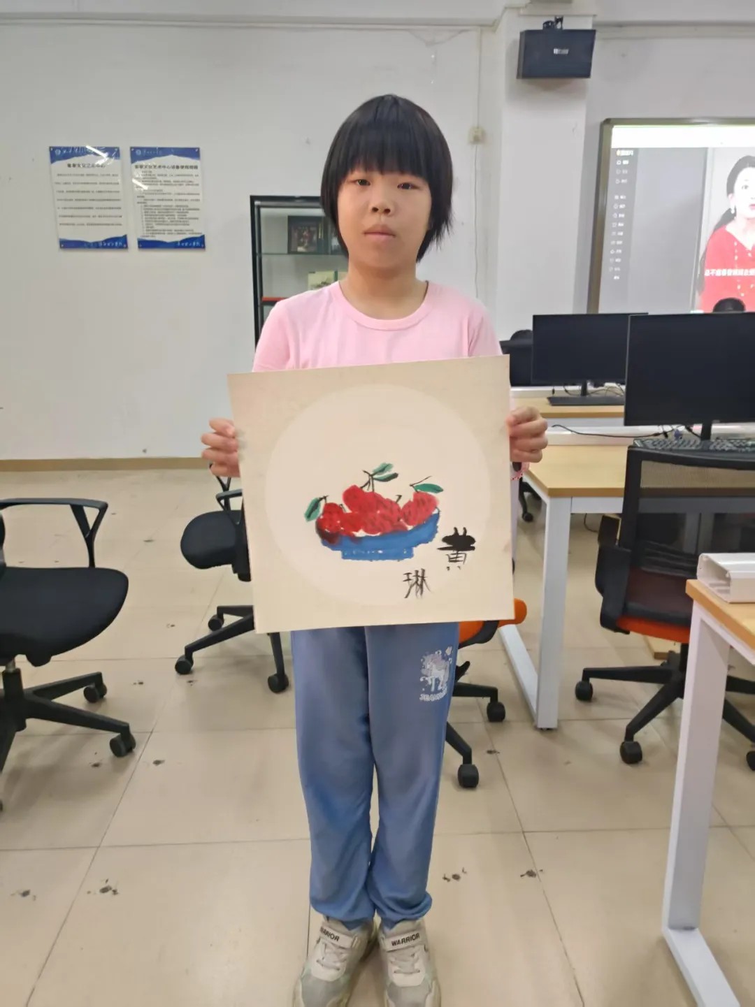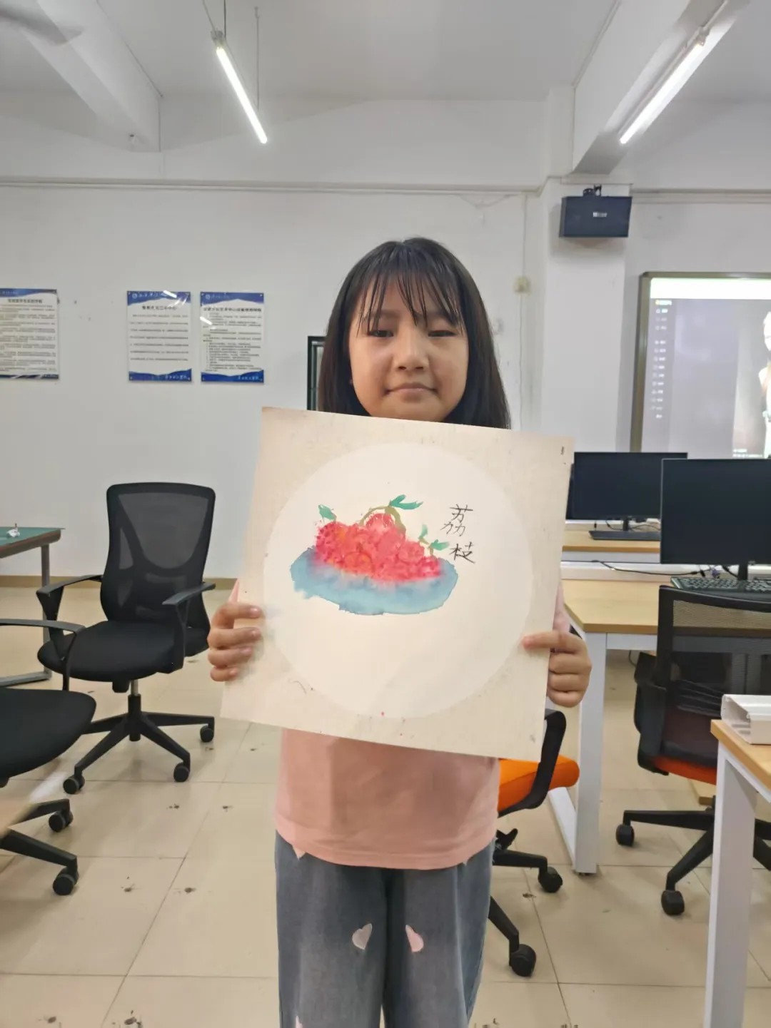 在绘画过程中,小朋友们全神贯注,精心调好颜色,以轻点的方式生动描绘出一颗颗饱满的果实,让那荔枝仿佛带着鲜活的生命力跃然纸上;再运用细腻的墨线,有条不紊地勾勒出荔枝的枝叶,将其形态展现得栩栩如生;最后用调配好的蓝色为碟子细致绘色,让整个画面更加完整且富有层次感。
