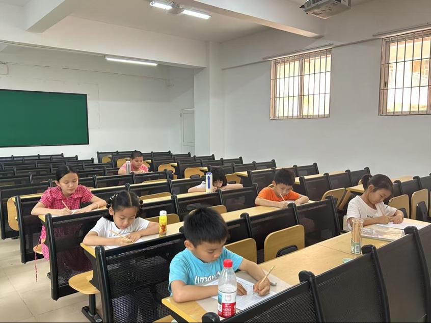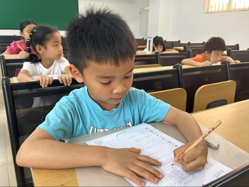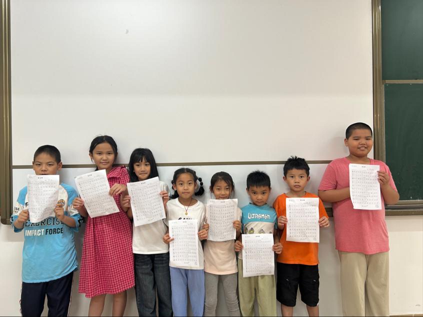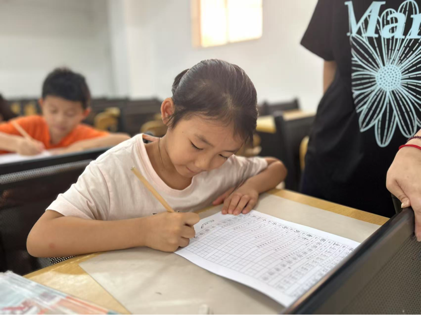 书法课堂聚焦汉字结构之美。学习"配、传、狮、追、叹、符、欲、魂、借、酒"十个汉字,通过拆解笔画顺序、演示空间布局,引导孩子们观察字形架构的疏密关系。从最初笔触稚嫩到逐渐掌握运笔力度,学员们在米字格上反复临摹,不仅规范了书写笔顺,更领悟到"计白当黑"的章法智慧。当作品展评时,端正秀丽的字迹印证着孩子们的进步。