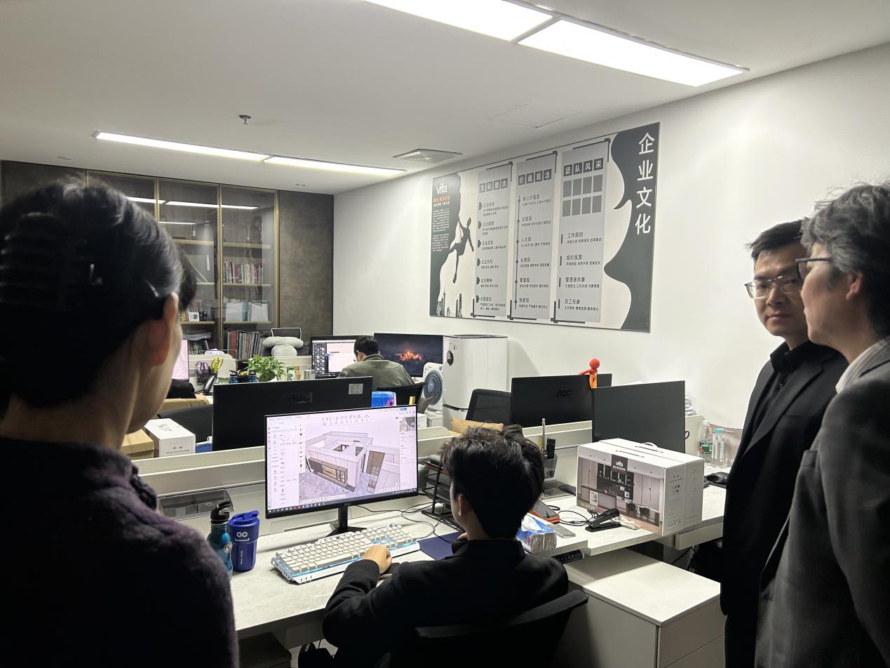 挂牌仪式后,在齐总的带领下,学院代表团参观了威法公司的展厅和办公区域,直观体验了其最新的设计产品,了解了威法员工的工作流程和职责分工,并就校企合作岗位需求、就业市场现状与学院学生专业能力的契合度展开了深入讨论。在参观过程中,尚华院长对威法公司在定制家居设计领域展现出的创新能力与卓越成就给予了高度评价。