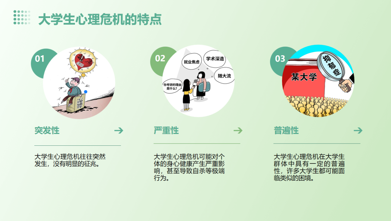 随后,班会深入探讨了大学生心理危机干预的重要性和方法。同学们了解到,建立心理危机预警机制、加强心理健康教育、提供心理咨询服务等是有效干预心理危机的关键措施。同时,班会还介绍了学校心理咨询与辅导中心的服务内容和资源,鼓励同学们在遇到心理困扰时积极寻求专业帮助。