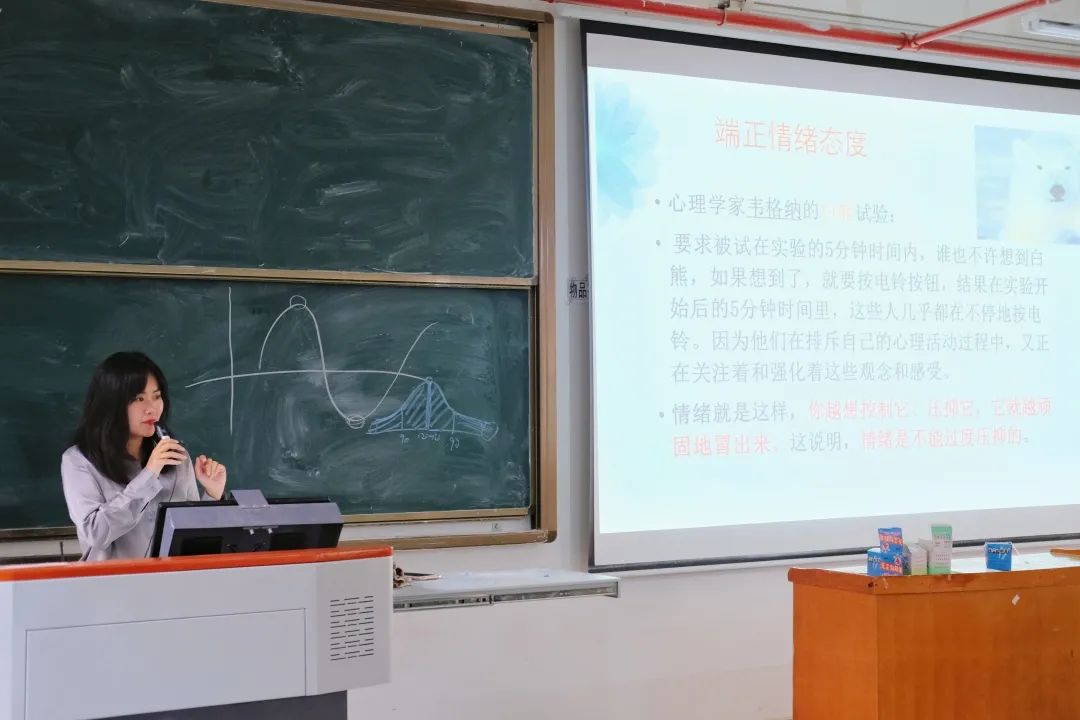 张晶晶老师通过看图测心理的实验引入讲座,讲解了健康的三维结构。张老师指出,生活质量低、学习工作效率低、注意力分散、生活缺乏动力、学习没有目标、茫然不知所措,感觉生活没劲;躯体反应为失眠,疲劳,乏力,食欲不振……等症状属于亚健康状态,近年来大学生抑郁症发病率逐年攀升。张老还通过多项实验详细分析了情绪的识别与调节的内容。