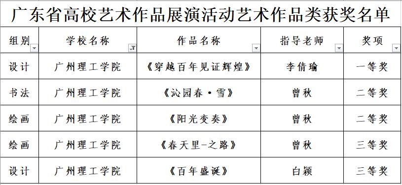 在上月由广东省教育厅举办的“广东省高校艺术作品展演”学科竞赛中,参赛学生共获得一等奖1项,二等奖5项,三等奖4项共计10项的优异成绩,为历年之最。