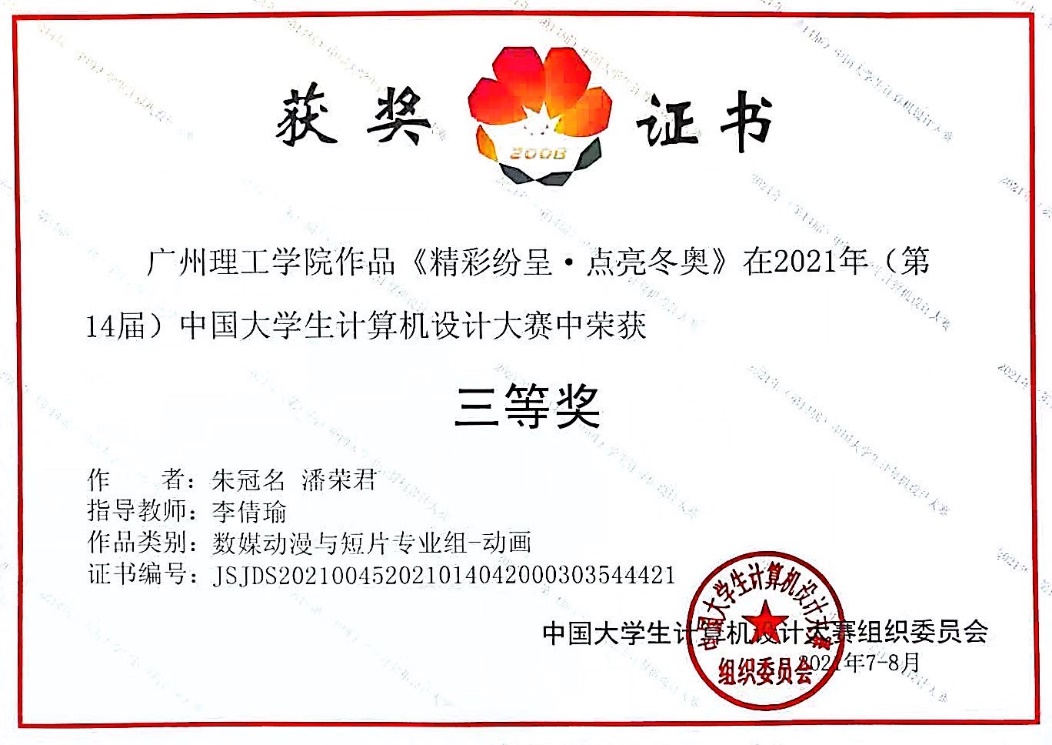近日,“中国大学生计算机设计大赛”落下了帷幕,我院朱冠名、潘荣君学生作品《精彩纷呈·点亮冬奥》获得了数媒动漫与短片专业组“三等奖”(指导教师:李倩瑜)。