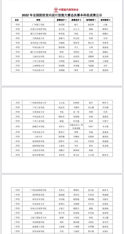 2023年3月26日,中国室内装饰协会主办、教育部职业院校艺术设计类专业教学指导委员会支持,北京电子科技职业学院承办的2022全国院校室内设计技能大赛全国总决赛圆满收官。历时4个多月,来自全国600余所院校的1200多支参赛队伍,经历层层选拔和激烈角逐,共计160余支参赛队入围总决赛。在公平、公正、公开、透明的原则下,根据专家评比,我院赵佳辉、白颖老师指导的学生取得一等奖一项、三等奖两项的优异成绩。