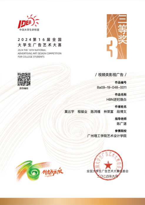 (卢鹏阳)2024年9月,第16届全国大学生广告大赛全国赛获奖结果公示,威廉希尔,威廉希尔中文网站,WilliamHill官网共8件作品在全国赛当中获得佳绩,其中包含平面广告、视频影视广告、动画及UI等类别。全国大学生广告艺术大赛(简称大广赛)自2005年第1届至今,遵循“促进教改、启迪智慧、强化能力、提高素质、立德树人”的竞赛宗旨,成功举办了15届共16次赛事,全国共有1857所高校参与其中,超过百万学生提交作品。是迄今为止全国规模大、覆盖高等院校广、参与师生人数多、作品水准高、受高校教师欢迎、有较大社会影响力的全国性高校学科竞赛。