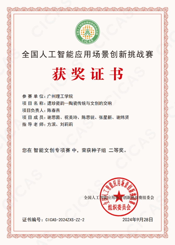 此次参赛的项目名称为《遗珍瓷韵——陶瓷传统与文创的交响》,团队成员包括陈春燕、谢思茵、祝美玲、陈思锐、张星新、谢炜贤,指导老师方滨和刘莉莉。通过团队的集体努力与协作,他们在比赛中展现了项目的独特创意和对人工智能与传统文化结合的深刻理解,赢得了评委的一致好评。
