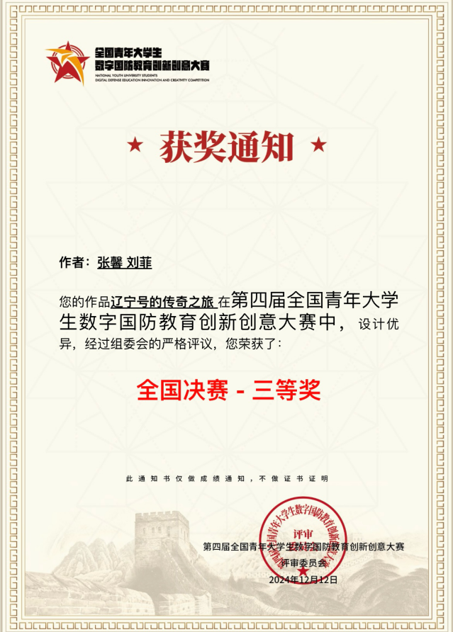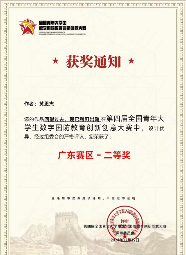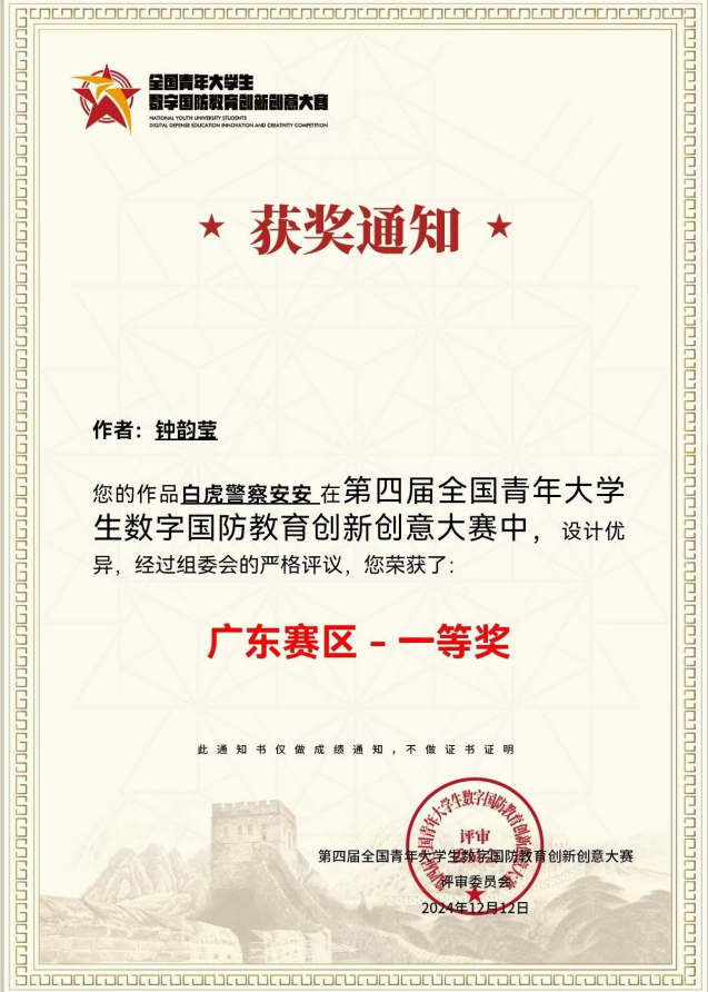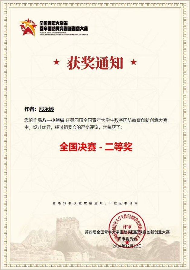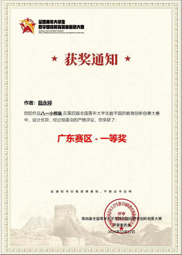 (周益姣)2024年第四届全国青年大学生数字国防教育创新创意大赛圆满落幕。此次大赛由国家一级协会中国信息协会主办,经济与国防协调发展专业委员会承办,旨在推动全民国防教育的深入发展。威廉希尔,威廉希尔中文网站,WilliamHill官网的学子们在此次大赛中表现出色,斩获了多个奖项,充分展示了学院在艺术设计教学方面的丰硕成果。