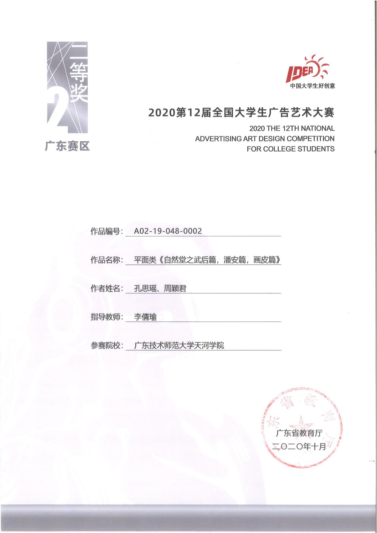 (通讯员李倩瑜)2020年第十二届全国大学生广告艺术大赛广东赛区,威廉希尔中文网站视觉传达设计专业孔思瑶同学和周颖君同学合作创作的平面类作品《自然堂之武后篇、潘安篇、画皮篇》在李倩瑜老师的指导下,从一万余件参赛作品中脱颖而出,喜获广东赛区二等奖。孔思瑶同学的平面类作品《逆行的战士》亦同时获得广东赛区三等奖。