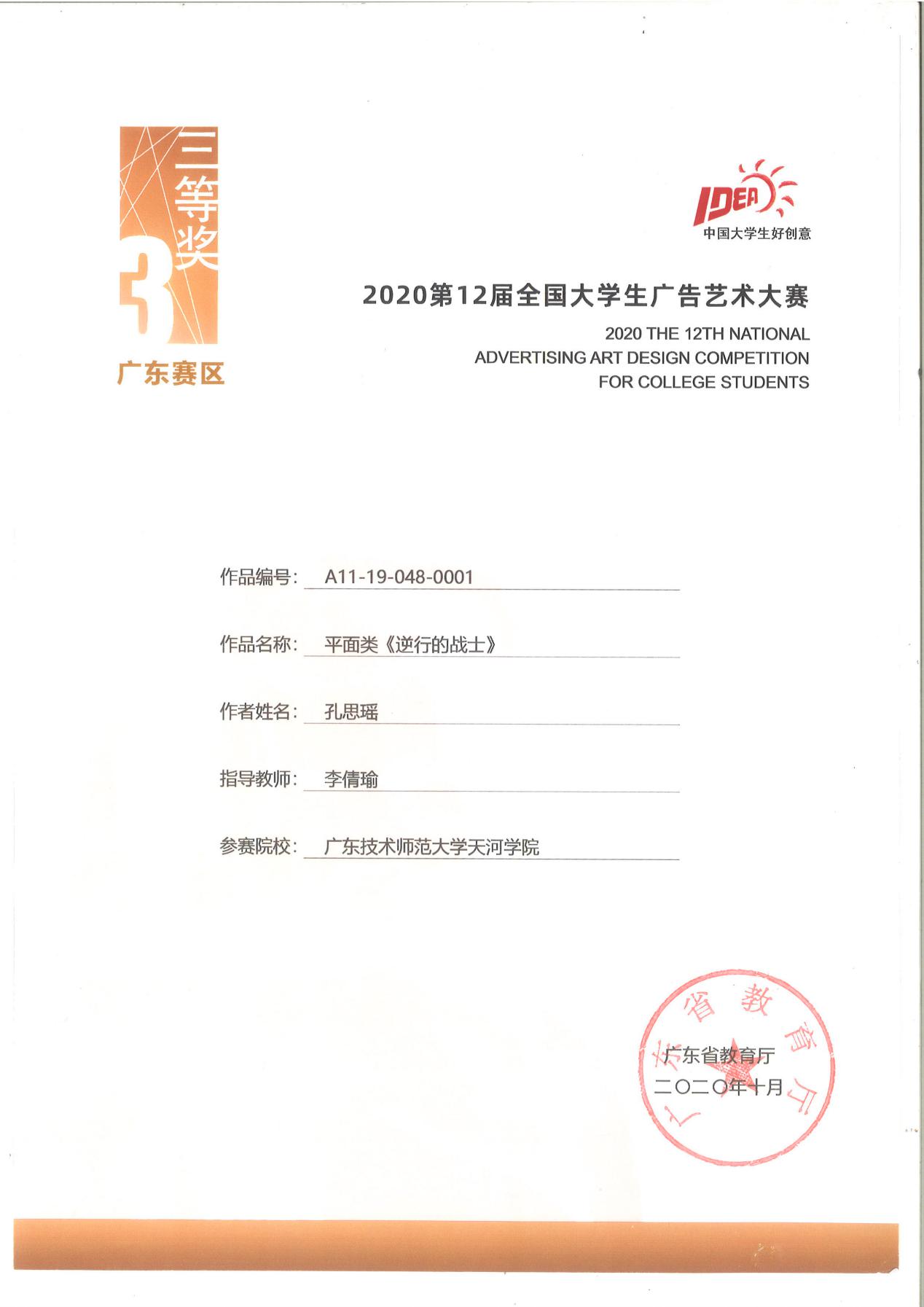 本届大广赛正值疫情期间,孔思瑶同学与周颖君同学克服居家创作、接受指导老师远程辅导等诸多困难,斩获夺省级两项大奖,展现了难得的竞赛风采。