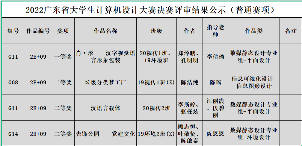 在平面设计组别中,由20视传1班郑泽鹏、19环境班孔明明同学创作,李倩瑜老师指导的作品《肖·形——汉字视觉语言形象包装》获一等奖;由20视传2班李斯婷、张槿炫同学创作,江丽霞、段碧丽老师指导的作品《汉语言载体》获平面设计组别二等奖。在环境设计组别中,由19环境2班(Z)顾志恒、叶敬贤、陈啟泰同学创作,陈恩恩老师指导的作品《先锋公园——党建文化》获得二等奖;在信息图形设计组别中,由19视传1班(Z)陈洁纯同学创作,陈瑶老师指导的作品《垃圾分类梦工厂》获得二等奖。