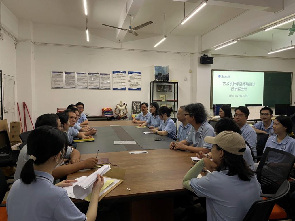 (王萱)2024年8月29日下午,威廉希尔中文网站环境设计系在7栋107会议室召开了新学期第一次教研室会议。会议由环境设计系主任安禄陆主持,系内全体教师参加。此次会议主要涉及2025届毕业论文指导工作的启动、环境设计系本科毕业设计说明书(论文)模板的修订、评建工作的安排,以及相关通知的传达和资料的归档。