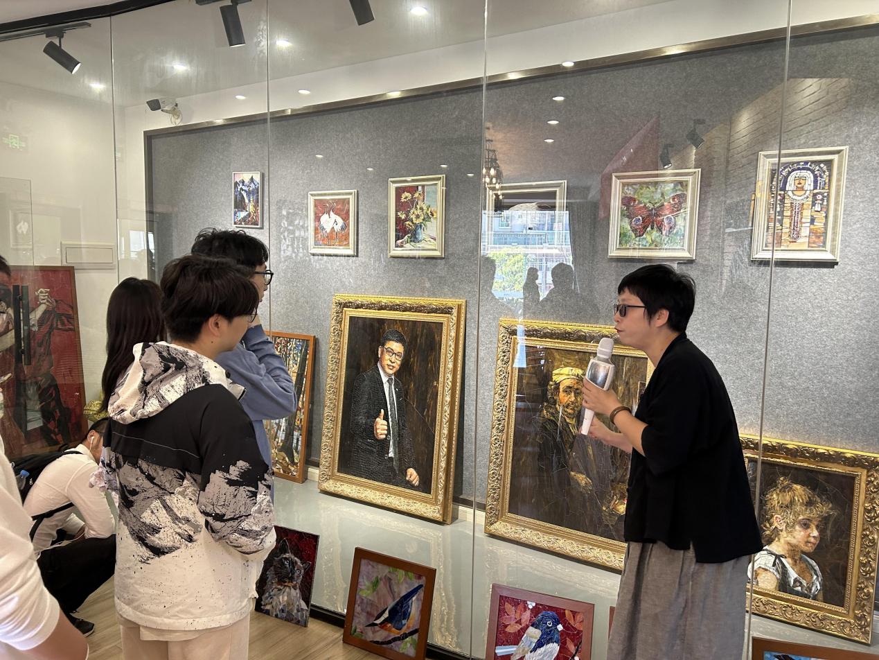 随后,师生一行来到了惠州市艺典彩玻建材有限公司,并与公司的负责人金美莉进行了交流。金美莉女士介绍了彩玻艺术与现代设计结合的潜力,详细讲解了彩玻镶嵌的原材料、工具及操作方法,并展示了实际应用成果。在交流过程中,她向学生们发出了实习邀请,鼓励他们在未来的毕业设计与实践中,积极探索彩玻镶嵌设计的无限可能,为环境设计领域注入新的灵感。同时,金美莉女士表达了对威廉希尔中文网站尚华院长所倡导的艺术教育与乡村项目、文创设计相结合理念的深切共鸣。她非常期待尚华院长提出的通过“文创+教育”合作模式的实施,将艺术与自然、文化与旅游相结合,推动乡村振兴,为乡村文化的传承与发展注入新的活力与创意。