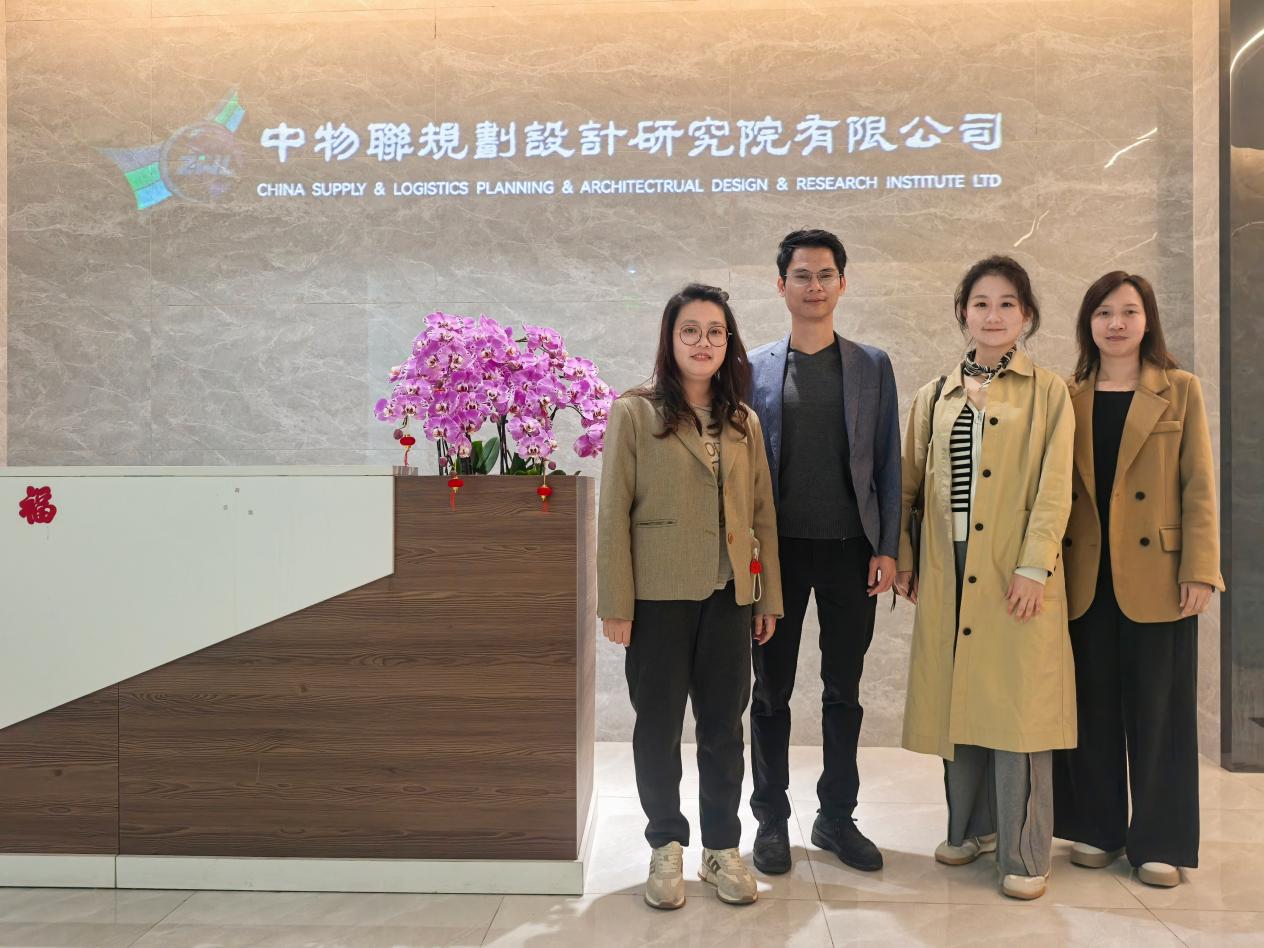 与中物联规划设计研究院有限公司合伙人(左一)、设计总监(左二)、人力主管(右一)合影留念