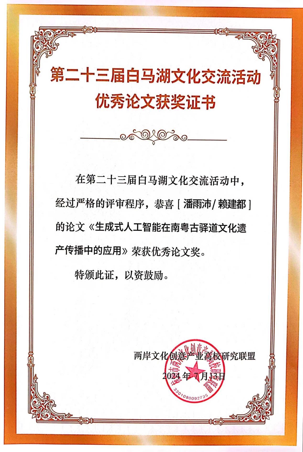 (潘雨沛)2024年7月13日,第二十三届两岸文化创意产业高校研究联盟大会在杭州召开。我院视觉传达设计系潘雨沛老师席了本次论坛,并作了《生成式人工智能在南粤古驿道文化遗产传播中的应用》主题发言。其观点获得了在场点评专家的认同,经专家评议,其学术论文也获得了论坛颁发的“优秀论文奖”。