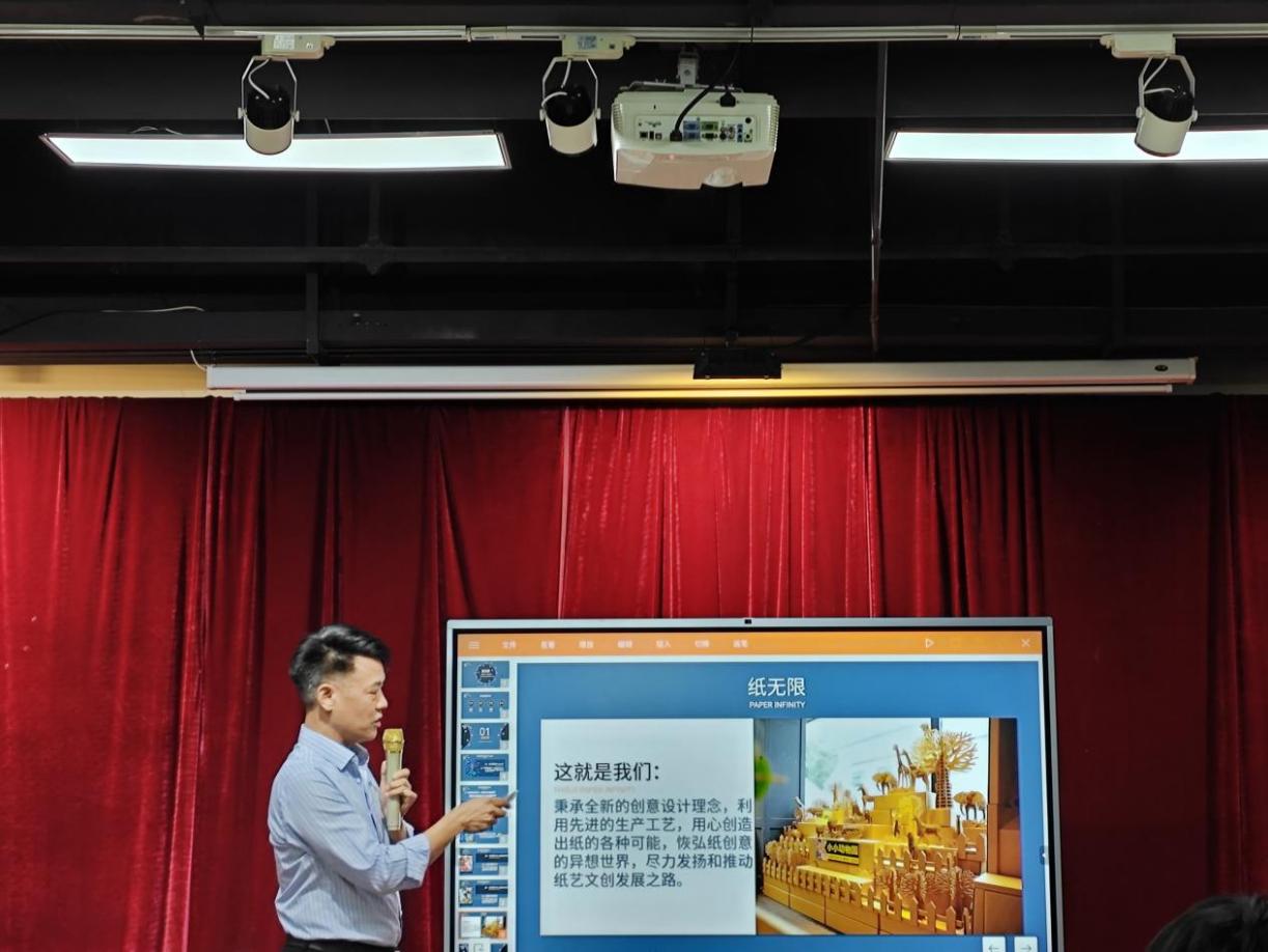 活动伊始,广东纸乎折也文化科技有限公司的张建总经理进行了精彩的分享,详细介绍了公司从杂志印刷业务起步到如今专注于纸质创意产品开发的成长历程。每一步变革都彰显了公司对市场动态的敏锐捕捉和对创新精神的执着追求。讲座结束后,张建总经理亲自带领同学们参观了公司的作品展厅,使大家得以近距离感受创意纸制品的魅力。