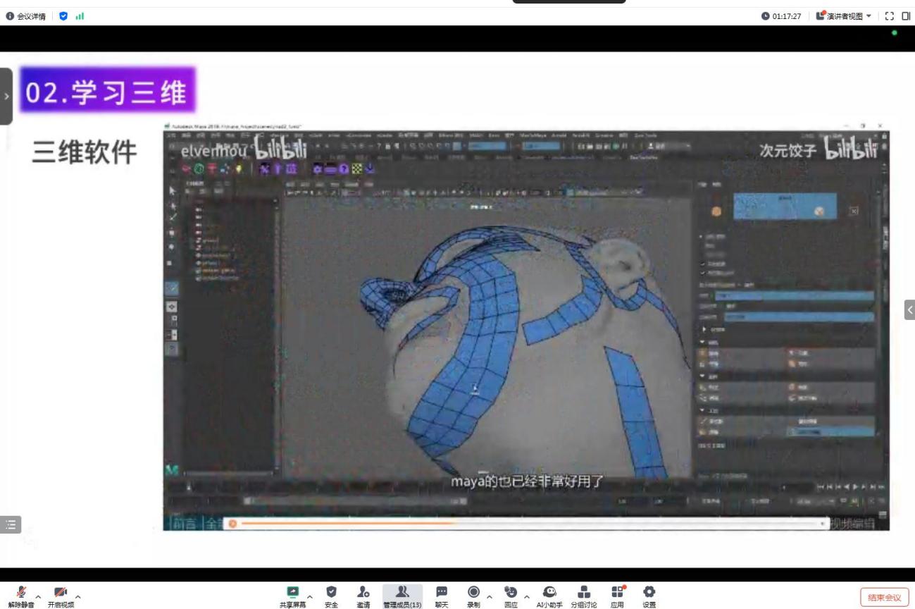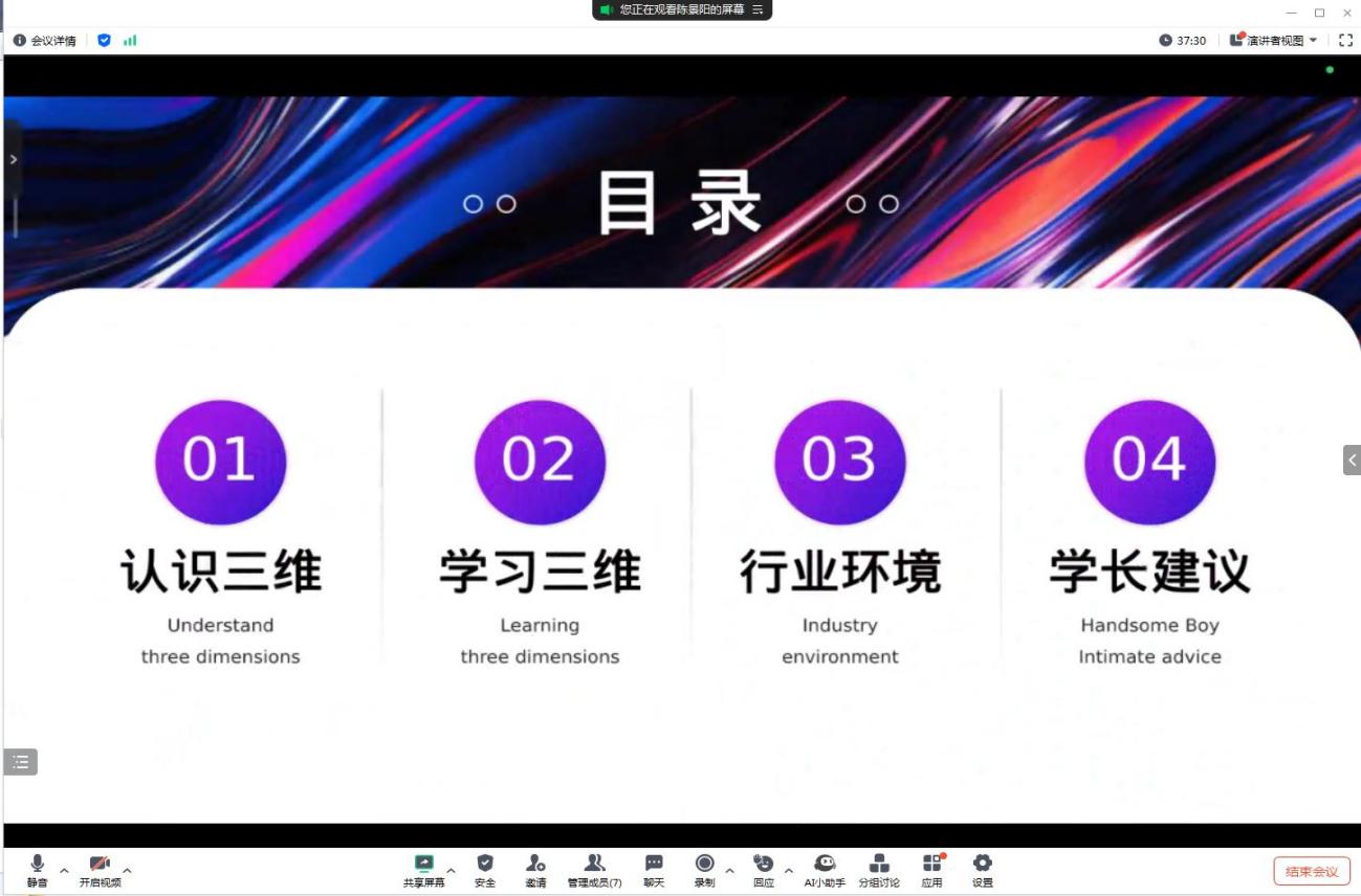 本次毕业校友分享会通过腾讯会议举行,陈景阳同学分享的主题为“开启三维艺术之旅”,他通过四个方面的内容和同学们分享了自己的工作经验和分析,这四个内容分别是:认识三维,学习三维和行业环境,还有行业环境。对于这四个题材,陈景阳同学做了非常详细充分的准备,他的PPT做得非常用心,原定计划讲一个半小时,但是具体开展讲座时候时长超过两小时,而且讲座效果非常好。