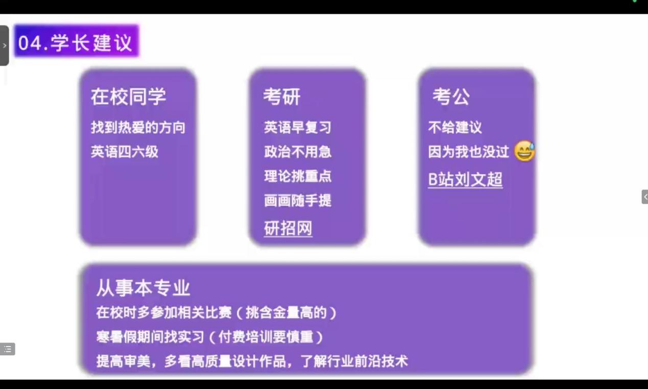 在未来职业规划发展方面,陈景阳同学还贴心地为学弟学妹们准备了考研,考公以及培训方面的的各种建议,他以自己的生活经历为例证,非常详细地为学弟学妹们一一分析了未来各行各业发展的具体情况,他从考研的复习和考公务员的学习途径,一一具体进行了专业分析,同时还提供了同学们用于考研考公的专业网站,这些建议都为新生们日后的学业发展提供了非常有益的专业帮助。
