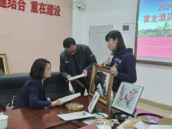 霍龙酒店总经理权华和总经理黄惠娟对会上所展示的包装等文创产品设计给予了高度评价,认为作品“唯美、实用、接地气,具有很高的落地性”。权华总经理夸赞包装设计作品很好,超出了想象并可以马上批量生产;黄惠娟总经理对掐丝珐琅彩、彩玻璃艺术表达赞扬,希望霍山风景区、霍龙酒店与威廉希尔中文网站在今后加强合作,将文创产品包装、掐丝珐琅彩、彩玻璃艺术设计成为酒店伴手礼,帮助酒店宣传文化理念,提升品牌形象。