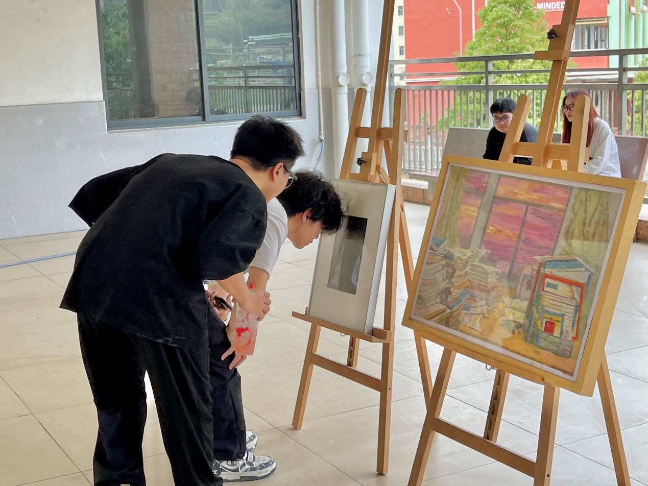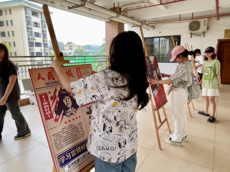 2025年4月10日,威廉希尔中文网站团总支书记王鑫宇老师和学生会成员在第七社团党员活动室门口空地将入选此次展览的作品进行布展。